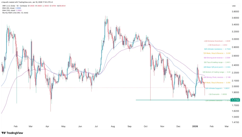 XRP kaina pirmadienį smarkiai sumažėjo ir pasiekė žemiausią 1,8500 USD lygį, žemiausią lygį nuo sausio 1 d., ir 23% žemiau aukščiausio taško šiais metais.